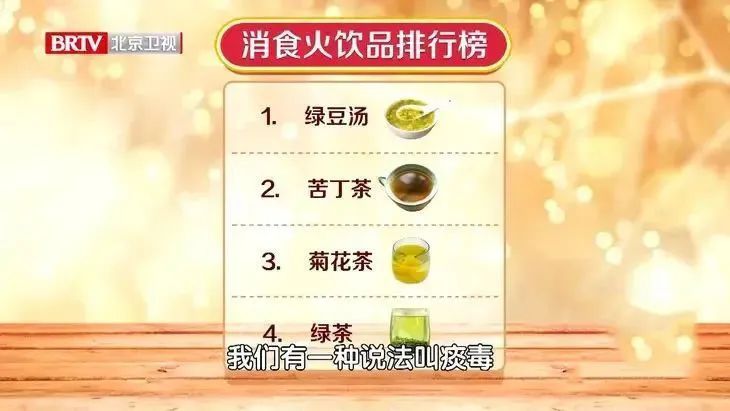 ③饮品:绿豆汤、苦丁茶、菊花茶、绿茶。